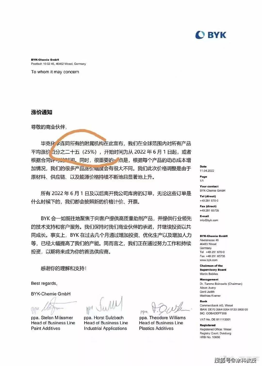 毕克化学:自6月1日起,在全球范围内对公司所有产品进行不同程度的调涨,平均涨价25%。