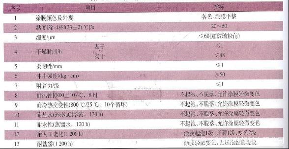 其它指标按相应国标:涂膜制备按GB/T1727-92;涂膜颜色与外观按GB 1727—79测试;细度按GB/T1724—79测试;黏度按GB 9269-88测试;附着力按GB/T1720—1979测试;柔韧性按GB/T1731—1993测试;冲击强度按GB/T1732—1993测试;干燥时间按GB/T1782—1979测试;耐水性按GB/T1733—1993测试;耐盐水性GB/T1763—1979测试;耐热性按GB1735—79测试;耐人工老化按GB/T1765—97测试;耐盐雾按GB/T1740—79(89)测试。