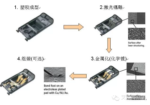 简单的说,就是在注塑成型的塑料支架上,利用激光技术直接在支架上雕刻三维电路图案,然后电镀使图案形成三维金属电路,从而使塑料支架具有一定的电气性能。此技术可应用在手机天线、汽车用电子电路、提款机外壳及医疗级助听器。目前最常见的是用于手机天线,一般常见内置手机天线,大多采用将金属片以塑胶热融方式固定在手机背壳或是将金属片直接贴在手机背壳上,LDS技术可将天线直接激光雕刻在手机外壳上,不仅避免内部手机金属干扰,更缩小手机体积。