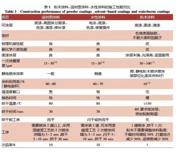 与溶剂型涂料、水性涂料相比,粉末涂料在施工性和投资运行成本方面具有一定的优势。针对我公司项目所使用的高耐侯高光泽低温固化双组分溶剂型涂料与水性涂料,结合粉末厂家提供的资料和技术交流成果,并查阅相关文献,整理得出表1与表2。