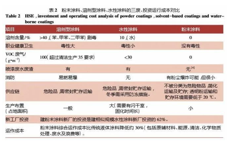 在不考虑废气处理及环保达标排放、排污费的情况下,相比之下,粉末涂料涂装工艺投资成本最低,水性涂料最高;粉末涂料涂装工艺运行成本居中,水性涂料最高;投资、运行成本粉末涂料比水性涂料减少约20%~30%。