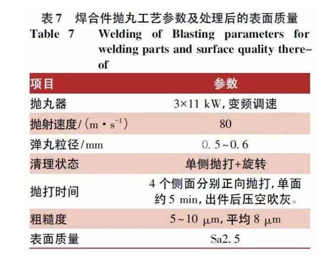 (4)焊合件如果抛丸不均匀会存在阴阳面,涂装后漆膜外观将出现局部光滑与局部麻点的明显对比面,影响整体外观效果,需要严格控制抛丸的功率和速度、丸粒的粒径、焊合件旋转速度等参数。